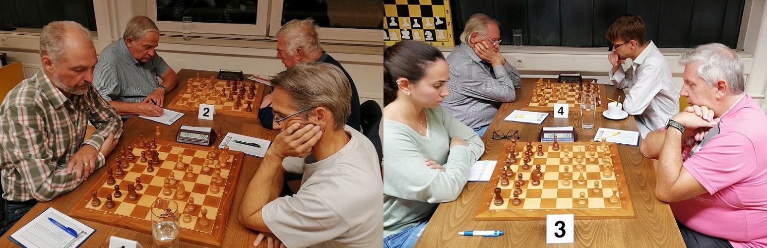 Erstmals wurde in unseren neuen Klubräumen in der Maximilianstraße Landesmannschaftsmeisterschaft gespielt. Bei Abgabe der Meldungen gingen wir noch davon aus, dass wir ein Team in jeder Liga haben werden, doch es kam anders. Durch den Rückzug Feldkirchs blieb unsere zweite Mannschaft in der Vbg-Liga und durch den Wegfall der C-Klasse haben wir nun zwei Teams in der B-Klasse. Es kam wie es kommen musste: man kreuzte die Klingen mit den eigenen Kolleg*innen. Die Ergebnisse blieben im Rahmen des Erwartbaren. Hohenems 2 mit den erst kürzlich gekürten Landesmeistern U14, U16 und U18 unterlag Hohenems 1 ehrenhaft mit 2:4. In der B-Klasse setzte sich Hohenems 3 gegen Hohenems 4 mit 3 : 1 durch. Im Bild links auf Brett 2 mit den weißen Steinen gegen Guntram Mathis spielend Enrique Lorita. Er gab ein Comeback nach 25 Jahren. Fast ebenso lange ist es bei Josef Schneider (rechts Brett 3 mit weiß spielend) her, dass er die letzte Partie für Hohenems spielte. Während Enrique ein Erfolgserlebnis gegönnt war, hatte Aydan Bas mit Josef weniger Einsehen. Auch Aydan spielte in den letzten Jahren nicht viel. Nach der Matura nahm sie ihr Medizinstudium in Innsbruck auf und zurück kam sie vor einiger Zeit als Ärztin. Ganz rechts Marcel Riegler, er besucht erst seit einigen Monaten die Klubabende und hatte gleich bei seinem Einstand gegen Helmut Cyris ein schönes Erfolgserlebnis. Thomas Marte und Kurt Kaufmann, links auf Brett 1 waren die Unauffälligsten bei dieser denkwürdigen Begegnung der beiden Teams in der B-Klasse.