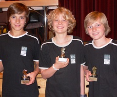 Im Bild die ersten drei in der Einzelwertung Unterstufe, alle vom BG Dornbirn. Gold für Enno Proyer (SK Dornbirn), Silber für Laslo Nussbaumer und Bronze für Vincent Nussbaumer (beide SK Hohenems). Die drei werden zusammen mit Nils Proyer, Patrick Nussbaumer und Coach Rudi Proyer vom 6. bis 10. Juni 2011 um die Medaillen beim Unterstufen Bundesfinale in Imst spielen.