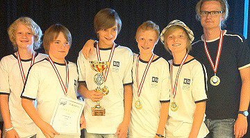 Drei mal Proyer (Enno - links, Nils - Dritter von rechts und Coach Rudi - ganz rechts) und drei mal Nussbaumer (Patrick - Zweiter von links, Laslo - Dritter von links und Viincent - Zweiter von rechts), dagegen war beim diesjährigen Bundesfinale der Schülerliga Schach (Unterstufenbewerb) kein Kraut gewachsen. Gleich am ersten Tag wurden die gefährlichsten Rivalen, das BRG Traun bzw. das BG/BRG Gleisdorf mit 3,5 : 0,5 bzw. 4 : 0 besiegt. Die Überlegenheit des Teams des BG Dornbirn war in diesem Bewerb einfach zu groß und äußerte sich in einem Rekordvorsprung von 9 Punkten vor dem Zweitplatzierten, dem BRG Traun aus Oberösterreich. Insgesamt wurden nur 1,5 von 36 möglichen Punkten abgegeben. Laslo, Enno und Vincent gewannen zudem die Brettwertung - davon Enno und Vincent mit je 100 % (8 aus 8 bzw. 9 aus 9). Patrick und Nils haben sich an Brett 4 abgewechselt und hätten die Brettwertung mit Sicherheit auch gewonnen, zusammen haben sie ebenfalls alle Partien gewonnen (je 5 aus 5). Solche herausragenden Erfolge kommen nicht zufällig zustande. Die konsequente und jahrelange Nachwuchsarbeit des SK Dornbirn (Proyers) und des SK Hohenems (Nussis) mit den besten Trainern und Trainerinnen des Landes bringt nun die Früchte.