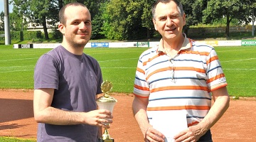 13 Spieler, ein Titelverteidiger und 12 Herausforderer, traten am vergangenen Samstag zum Klubturnier 2011 an. Mit 7 Punkten aus eben so vielen Partien verteidigte Robert Sandholzer seinen Titel vom Vorjahr souverän. Den zweiten Platz mit 5,5 Punkten belegte Obmann Reinhard Kuntner, der den Ansturm der Jugend noch einmal erfolgreich abwehren konnte. Bestplatzierter Jugendspieler war auf Platz 3 Vincent Nussbaumer mit 5 aus 7. Anschließend wurde nach einer langen und überaus erfolgreichen Saison ordentlich gefeiert. Das Wetterglück blieb uns auch bei der heurigen Sommerparty erhalten, sodass sich unser Nachwuchs (U60 - das wurde großzügig ausgelegt) auch beim Fußballspielen austoben konnte. Eine Schacheinlage war aber dann am späteren Nachmittag dennoch dabei. Nachwuchstrainer Milan Novkovic trat gegen 13 Spieler an und gewann die Simultanvorstellung mit 11:2 ganz klar. Bild rechts: Obmann Reinhard Kuntner (rechts) überreicht den Siegerpokal an Robert Sandholzer.