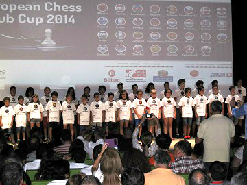 Kinder aus Bilbao repräsentierten die 31 teilnehmenden Nationen. Drei Teilnehmern, Pentala Harikrishna als Vertreter des letztjährigen tschechischen Überaschungs-Europacupsiegers Novi Bor, die erst 20-jährige dreifache Weltmeisterin Hou Yifan als Vertreterin des Europacupsiegerteams der Frauen 2013, Monte Carlo sowie Levon Arionian als Gewinner des Weltcupfinales 2013 wurde dann auf der Bühne als besondere Willkommensgeste eine traditionelle baskische Mütze aufs Haupt gesetzt. Die Freude währte allerdings nur kurz, denn diese Mützen mussten am Ende der Eröffnungsfeier den Organisatoren retourniert werden, sind sie doch für die Sieger 2014 vorgesehen.