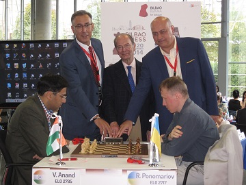 In der Eröffnungspartie gegen den sichtlich wiedererstarkten Ex-Champion Viswanathan Anand nützte das alles nichts. Vishi rang Ponomariov nieder wie in seinen besten Zeiten. In der Parallelpartie erzielte Lokalmatator Valejo mühelos ein Remis mit Schwarz gegen Levon Aronian. Bild: Bürgermeister und ECU Präsident sowie ein weiterer Offizieller kurz vor Eröffnung der Partie.