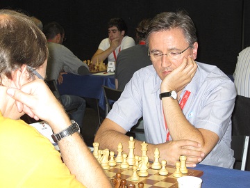 Valery Atlas spielte die zweite Partie hintereinander mit Schwarz  und schaffte auch das zweite Remis, ebenfalls mit einer Zugwiederholung. Bemerkenswertes Detail am Rande: beim Friedesschluss war noch kein einziger Stein geschlagen. Weiss schreckte vor einer Linienöffnung am Damenflügel doch zurück, hatte sein König doch groß auf die Damenseite rochiert.