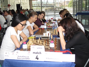 Obwohl wie bei vielen Schachturnieren auch in Bilbao die überwiegende Mehrzahl der Teilnehmer männlich sind, wird auch ein hochkarätig besetzer Frauenbewerb gespielt. Das erfolgsverwöhnte Team von Monte Carlo (Bild links mit Weltmeisterin Hou Yifan auf Brett 1) verlor völlig unerwartet sowohl in Runde 1 als auch in Runde 2. Heute gelang mit einem knappen 2,5 : 1,5 der erste Mannschaftsieg gegen den deutschen Meister Königshofen. Elisabeth Pähtz (Königshofen) gelang dabei ein vielbeachtetes Schwarzremis gegen die Weltmeisterin. Die Chancen auf eine titelverteidigung von Monta Carlo sind wohl nur noch theoretischer Natur. Nach drei Siegen hintereinander ist nun das Team von Batumi, Georgien, unter anderem mit Melia Salome der neue Favorit auf den Titel. Entschieden ist aber noch nichts. Bei den Frauen sind 6 sehr starke Teams am Start, dazu zwei Mannschaften aus Israel, die wohl Platz 7 und 8 unter sich ausmachen werden. Bei den Frauen wird vollrundig gespielt.