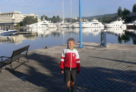1. e4 c5 2. Sf3 Sc6 3. Sc3 g6 4. d4 cd4: 5. Sd4: Lg7 6. Le3 d6 7. f3 Sf6 8. Dd2 0-0 9. 0-0-0 Sd4: 10. Ld4: a6 11. g4 b5 12. Kb1 b4 13. Sd5 a5 Die Diagrammstellung. Der nächste Zug von Benjamin der eine Damenjagd einleitet ist natürlich verlockend. Er führt aber zu nichts. Die Dame läßt sich nicht fangen. Im Gegenteil, Benjamin muss aufpassen aus diesem Jagdabenteuer mit einem blauen Auge davon zu kommen. Besser wäre hier gewesen mit 14. Sf6: Lf6: 15 Lf6: ef6: 16. Dd6: einen Bauern zu gewinnen. Statt dessen kam 14. Lb6 Dd7 15. Sc7 Tb8 16. Lb5 Dd8 17. Df2 Ld7 18. Sd5 De8 19. Ld7: Dd7: 20. Lc5 Dieser Zug stellt eine gefährliche aber leicht zu sehende Falle. Der Läufer darf wegen anschließendem Sf6+ und Damenverlust nicht genommen werden. Sd5: 21. Td5: a4 Das Jagen und Fallenstellen hat Benjamin nichts gebracht, im Gegenteil, Schwarz steht nun bereits angenehmer. Die Stellung ist aber noch haltbar. Hier sollte am besten 22. Ld4 gespielt werden um den gefährlichen schwarzen Fiancettoläufer abzutauschen. Statt dessen spielt Benjamin einen Zug, der die Partie aus der Hand gibt: 22. a3? ba3: 23. La3: Db7? Jetzt patzt der Gegner. Mit 23. ... Lb2: 24. Lb2: a3 25. Dd4 Tb2:+ 26. Ka1 Tfb8 wäre die Sache gelaufen gewesen. Der junge Este behält aber auch nach dem Textzug weiter eine Gewinnstellung, es ist aber überhaupt nicht mehr leicht. 24. c4 Db3 25. Tb5 Dc4: 26. Tb8: Tb8: 27. Dc2 Db5 28. Tc1 Lb2:? Im 23. Zug wäre dieser Zug entscheidend gewesen, jetzt verliert Schwarz einfach nur eine Figur und Weiss übernimmt wieder das Kommando. 29. Lb2: f6 30. Ka1 Kg7 31. Tb1 Ta8?? übersieht den folgenden taktischen Einschlag auf f6 und verliert Dame und Partie auf der Stelle 32. Lf6:#. Heute hatte Benjamin auch das nötige Glück. Aber so ist Schach. Man muss oft viele gute Züge hintereinander machen um eine Gewinnstellung zu erhalten, ein einziger falscher Zug genügt aber, die Stellung zu verderben. Heute hat Benjamins Gegner unglücklich verloren. In einem 11-rundigen Turnier wie dieser Weltmeisterschaft heben sich Glück und Pech aber meist auf. Früh am Morgen haben Stefan und Benjamin die Gegend in Porto Carras bei einem ausgiebigen Spaziergang erkundet. Hier haben sie den Jachthafen erreicht. Ob die Besitzer immer brav ihre Steuern bezahlt haben?