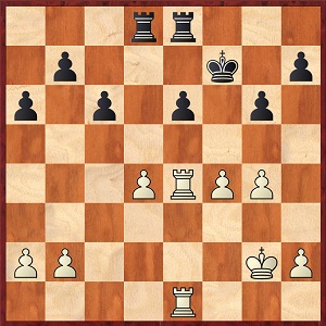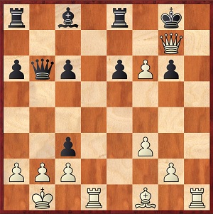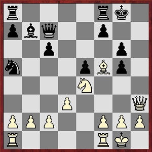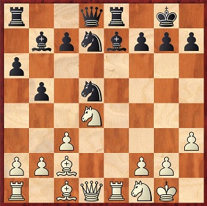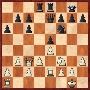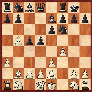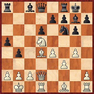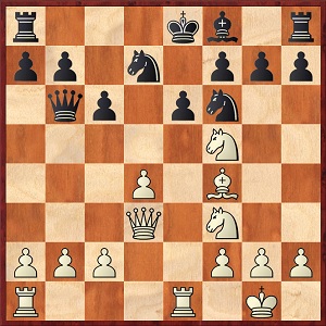 1. e4 e5 2. Sf3 Sc6 3. Lc4 Sc6 4. Sg5 d5 (das Zweispringerspiel, klassisch) 5. ed5: Sa5 6. Lb5+ c6               7. dc6: bc6: 8. Df3 Lb7 9. Ld3 Le7 10. 0-0 h6 11. Se4 0-0 12. Sbc3 Se4: 13. Le4: Dd7 14. Lf5 Dc7 15. d3    Lg5 16. Lg5: hg5: 17. Dh3 g6 18. Se4