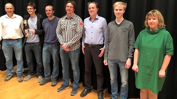 Vorarlbergliga Foto Meistermannschaft von links nach rechts: Obmann Reinhard Kuntner, Julian Kranzl, Robert Sandholzer, Philipp Lins, Teamcaptain Guntram Gärtner, Emilian Hofer, Olga Kurapova