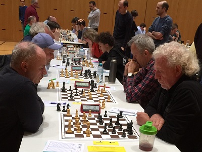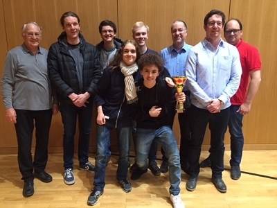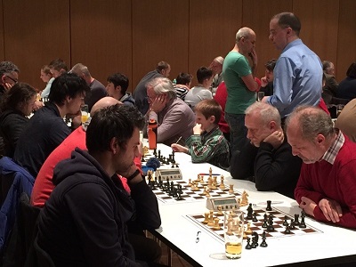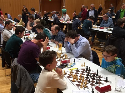 Bild: auf der rechten Seite vorne auf Brett1 Renato Frick, Brett 2 Wilfried Spiegel, Brett 3 (nicht im Bild) Duke Kreutzmann, Brett 4 Yasin Channaoui, Brett 5 Olga Kurapova, Brett 6 (nicht im Bild) Andreas Kezic