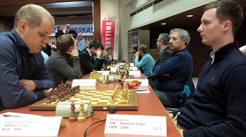 Bild: das meisterschaftsentscheidende Match Hohenems - Feffernitz mit Falko Bindrich und Ed Rozentalis auf den Brettern 1 und 2 (rechte Seite). Feffernitz musste alle Register ziehen um nach sehr hartem Kampf nach 5 Stunden schlussendlich den BL-Wanderpokal für zumindest ein Jahr zu erobern..