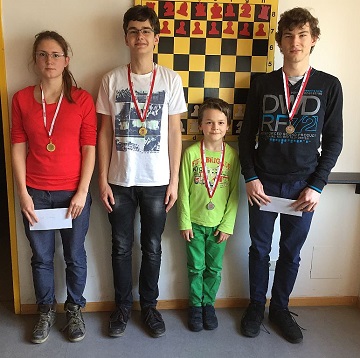 Julian gelang die Wiederholung des U16 Vorjahrstitels, diesmal in der Kategorie U18. Leider sind heuer nur 4 Spieler zu den Landesmeisterschaften angetreten. Gespielt wurde daher doppelrundig. Julian holte 5 Punkte aus den 6 Partien. Einmal musste er sich U10 Spieler Leopold Wagner geschlagen geben. Julian und Leopold fahren zu den Staatsmeisterschaften U16/U18 vom 19. - 24. März in St. Veit. Bild v.l.n.r.: Anastasia Baschak (Sonnenberg), Julian Kranzl (Hohenems), Leopold Wagner (Wolfurt) und Alexander Gerold (Rankweil)