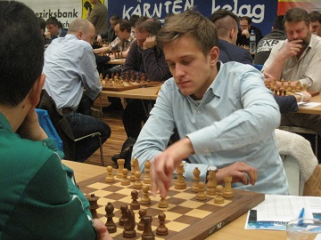 In dieser Situatation kam gerade recht, dass Ed Rozentalis sehr schnell für klare Verhältnisse sorgte und sehr früh auf 0-1 für Hohenems stellte. Bei Sasa stellte sich der Minusbauer nicht als großes Handicap heraus, die halboffene b-Linie das Läuferpaar und Initiative am Köningsflügel warem bald eine mehr als ausreichende Kompensation. Schließlich schloss Sasa nach einigen Abtäuschen ein Turmendspiel siegreich ab und stellte auf 0-2. Bei knapper Bedenkzeit griff auch Falkos Gegner daneben, was unserem Brett 1 Spieler einen Königsüberfall mit Mattabschluss erlaubte. 0-3. Georgs Gegner entschloss sich im Mittelspiel eine Qualität gegen drei Bauern abzugeben, schlitterte bei knapper Bedenkzeit kurz vor der Zeitkontrolle jedoch in eine Verluststellung. 0-4. Damit war der Wettkampf endgültig gewonnen, Valery fügte sich ins unvermeidliche Remis. Nach einigen Ungenauigkeiten seines Gegners eröffneten sich Noel plötzlich doch noch Angriffschancen am Königsflügel, die dann auch genutzt wurden. Endergebnis: 0,5-5,5. Bild: Noel Studer bei seinem Debüt in der 1. Österreichischen Bundesliga.