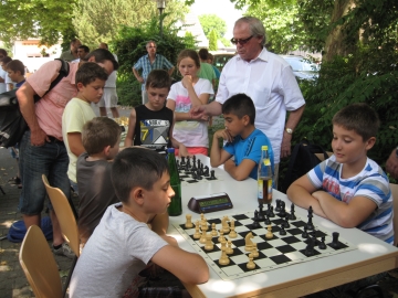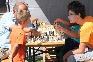 Beim Abschlussfest am Schlossplatz übernahmen dann Michael Rumpold und Julian Kranzl (Bild rechts) die Trainerrolle und zeigten den vielen interessierten Kindern die Gangart der Figuren und den Unterschied zwischen Matt und Patt. Der Stand war über drei Stunden gut besucht und die Kinder sehr neugierig. Auch das Wetter machte heuer der Veranstaltung am Schlossplatz keinen Strich durch die Rechnung. Vielfach wurde der Wunsch geäußert, öfters Gelegenheit zu Training und Spiel mit anderen Kindern zu haben. Diese Gelegenheit wird es bald geben: