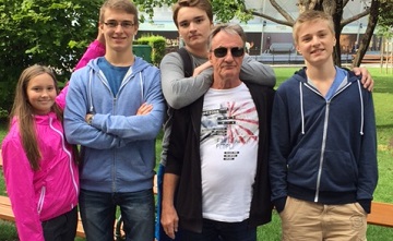 Besonders Leon stieß mit einer ELO-Performance von 2080 in neue Dimensionen vor. Nach zunächst verhaltenem Start (1 aus 5) war Leon in der zweiten Turnierhälfte nicht mehr zu bremsen (4 aus 4 !!) Der Lohn: sehr gute 5 aus 9 in der überaus stark besetzten A-Gruppe und ein FIDE Rating-Plus von 45 Punkten. Vincent blieb in etwa im Rahmen der Erwartungen, Patrick fand zu alter Stärke zurück (beide 3,5 aus 9). In der C-Gruppe kämpften Maria (3,5 Punkte) und Alexa (3). Beide verbesserten damit ihre persönliche ELO-Zahl zum Teil deutlich. Mit von der Partie war einmal mehr Martin Lachat (der Mann mit der Sonnenbrille). Von links nach rechts: Alexa, Leon, Patrick, Vincent, Foto MN