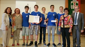 Bild: das Siegerteam mit Betreuerin Helene Mira (Zweite von links), Julian Kranzl, Patrick Nussbaumer, Vincent Nussbaumer, Laslo Nussbaumer (alle SK Hohenems) und Enno Proyer (SK Dornbirn).