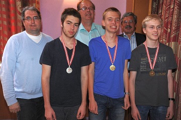 Zunächst schrammte Emilian (Bild rechts) mit dem Team Vorarlberg bei der Bundesländer-Mannschaftsmeisterschaft und bei der Schnellschach Staatsmeisterschaft mit vierten Rängen noch knapp am Podest vorbei. Beim abschließenden Blitzbewerb U16 klappte es dann doch noch mit der Medaille. Es wurde Bronze hinter den beiden Topfavoriten Martin Christian Huber (Gold - Steiermark, Bild Mitte) und Valentin Dragnev (Silber - Wien, Bild links)