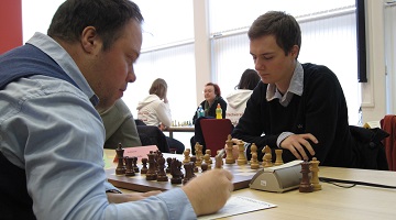 Der schwierigste Gegner des Wochenendes stand uns am Samstag mit dem SK Maria-Saal bevor. Die leichten ELo-Unterschiede wurden im wesentlichen durch die Farbverteilung ausgeglichen. So ergaben sich nach Kampf 5 Remis. Auf Brett 3 jedoch schaffte es Falko Bindrich von Beginn weg seinen deutschen GM-Kollegen Rainer Buhmann sowohl stellungsmäßig als auch was die Bedenkzeit betraf unter Druck zu setzen. In komplexer, jedoch für Falko deutlich vorteilhafter Stellung griff Buhmann in Zeitnot daneben und musste die Partie aufgeben. Lange Zeit machte auch David Baramidze Gewinnversuche in einem Turmendspiel mit Mehrbauern gegen Markus Ragger. Kurz vor Partieende gab es dann auch eine Gewinnfortsetzung. David wählte jedoch eine andere Variante und ließ Österreichs Nummer 1-Spieler glücklich ins Remis entschlüpfen. Bild: Falko Bindrich (weiss) gegen Rainer Buhmann, die entscheidende Partie dieses Wettkampfs.