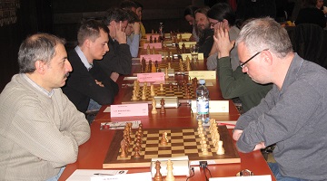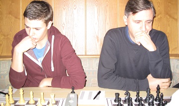 1. Bundesliga 2013/14 mit Partien. Bild: Absam gegen Hohenems. Ed Rozentalis (Hohenems, links) überrascht Thomas Luther (Absam, rechts) mit einer zweischneidigen Variante der Aljechin-Verteidigung.