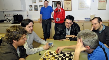 Bild: Matthias Burschowsky, Guntram Gärtner, Robert Jedlicka, Robert Sandholzer und Günter Amann bei der nächtlichen Analyse der zuvor gespielten Partien. Im Hintergrund: Reinhard Kuntner und Kai Medwed.