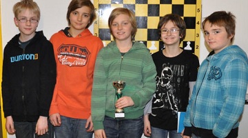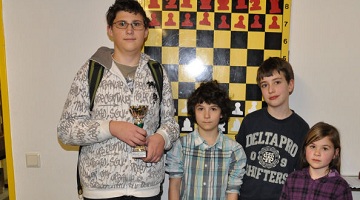 Die Nachwuchs-Landesmeisterschaften 2011 sind abgeschlossen. Für Hohenems gab es noch einmal Spitzenplätze in den verschiedenen Altersklassen. Einen weiteren Titel, den vierten für den SK Hohenems erkämpfte sich Vincent Nussbaumer (Bild: erster von links) in der Kategorie U14. Im direkten Duell gegen den Topfavoriten Felix Bahl (SK Bregenz) gleich zu Beginn des Turniers behielt Vincent die Oberhand. Im weiteren Verlauf gaben sich sowohl Vincent als auch Felix keine Blöße mehr und gingen als Erster und Zweiter mit einem Punkt Abstand durchs Ziel.