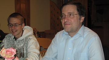 Licht und Schatten wechselten sich in Graz zwar ab, unterm Strich durften wir aber mit dem Ergebnis zurfrieden sein. In Runde 4 - noch ohne David Baramidze - gab es ein eher glückliches 3:3 Remis gegen Mayrhofen/Zillertal. In Runde 5 gelang der erwartete Pflichtsieg gegen Pöchlarn gleich im Ausmaß von 5:1. In der 6. Runde lief dann allerdings nichts zusammen: Salzburg hatte mit IM Stefan Bromberger Verstärkung geholt und lieferte uns einen erbitterten Kampf in dem wir schließlich mit nur 4 Remis eine empfindliche aber verdiente Niederlage kassierten. Damit war Hohenems vor der 7. Runde gegen Lackenbach bereits wieder unter Druck geraten. Gegen die Burgenländer lief der Motor dann aber rund und der wichtige zweite Matchsieg in dieser Saison konnte unter Dach und Fach gebracht werden. Hohenems verbesserte sich damit vom 11. auf den 7. Rang. Die besten Scorer waren David Baramidze und Guntram Gärtner mit 2,5 aus 3. Ebenfalls 2,5 Punkte (ohne Niederlage) allerdings aus 4 Partien steuerte Alexander Naumann bei. Ausgeglichen mit 2 aus 4 präsentierten sich Ed Rozentalis und Valery Atlas. Georg Fröwis startete zunächst mit einer deutlichen Niederlage gegen Fabian Platzgummer holte dann aber noch 1,5 Punkte und damit 50 % der möglichen Punkte. Dmitry Atlas hatte bei seinen 1 aus 3 Pech, denn in der einzigen Verlustpartie vom Sonntag hatte er bereits großen Vorteil, verlor in Zeitnot aber den Faden. Bild: Guntram Gärtner (rechts) gab in dieser Grazer Runde ein sehr erfolgreiches Comeback und hat zusammen mit Georg Fröwis (links) am Abend beim gemütlichen Teil gut lachen. Immer mehr zu einer echten Stütze wird Georg Fröwis. Wie schon gegen Baden in Runde 3 steuerte er wieder in der Sonntagsrunde diesmal gegen Lackenbach und mit dem vollen Punkt entscheidend zum Mannschaftssieg bei.