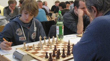 Das Absamer BL-Wochenende begann mit einer knappen 2,5 : 3,5 Niederlage gegen Ranshofen. Das Freitagsmatch war ein echter Bundesliga-Fight auf Biegen und Brechen der ein etwas kurioses Ende fand. Zunächst gelang es unseren Spielern einige schlechte und sogar verlorene Stellungen zu halten. Valery Atlas bot gegen GM Medvegy eine glänzende Verteidigungsleistung und auch sein Bruder Dmitry hielt IM Dovzik jederzeit auf Distanz. Mit Sorgen hingegen mussten lange Zeit die Partien von Robert Sandholzer, Matthias Burschowsky und Leon Nussbaumer betrachtet werden. Allen dreien gelang es aber irgendwie, zum Teil mit großem Glück zu überleben. Ausgerechnet die einzig wirklich besser stehende Partie entglitt Guntram Gärtner dann bei knapper Zeit. Guntram stand ganz unter dem Eindruck des kritisch stehenden Wettkampfes und war überzeugt, seine Partie unbedingt gewinnen zu müssen. Das ging schief und nach einem Bauerneinsteller war dann sogar der ganze Punkt weg. Schade, aber der Ranshofener Sieg ging insgesamt in Ordnung. Bild: Der erst 15-jährige Leon Nussbaumer holte in seiner erst dritten Bundesligapartie gegen Wolfgang Hackbarth erstmals ein Remis und nimmt aus diesem Wochenende sicher jede Menge Motivation mit.
