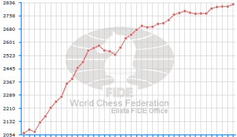 742 ELO-Punkte in neun Jahren (von 2084 im Juli 2001 auf 2826 im Juli 2010) hat der norwegische Weltklassemann Magnus Carlsen gewonnen (Graphik rechts). Damit ist er Garry Kasparov der im Jänner 2000 die bisherige Höchstzahl von 2851 Punkten erreichte bereits hart auf den Fersen.