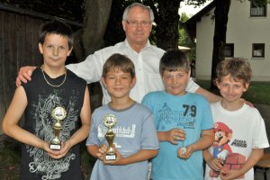 Einen ganz tollen Erfolg für Helmut Cyris' Schützlinge gab es in der Beginnergruppe in der durchwegs junge Spieler am Start waren, die noch nicht viel Turniererfahrung gesammt haben oder gar erstmals ein Schachturnier spielten. Justin Kaufmann und Timo Bader gewannen zunächst 4 Partien in Reihe und standen danach quasi im Finale, wo die beiden den Sieg unter sich ausmachen konnten. Da diese Partie remis endete, setzte die Turnierleitung zur Ermittliung des Turniersiegers eine Blitzpartie an, die dann Timo Bader (zweiter von links) gewinnen und somit seinen ersten Siegerpokal mit nach Hause nehmen konnte. Aber auch für Justin (erster von links) war der zweite Platz ein ganz hervorragendes Ergebnis, ebenso wie der fünfte für Julian Mathis (dritter von links). Sein allererstes Turnier überhaupt spielte Nico Leiner (rechts) aus Helmut's Schülergruppe an der Volksschule Hohenems-Markt. Der Zweitklässler war mit großer Begeisterung bei der Sache und erkämpfte sich bereits bei seinem allerersten Turniereinsatz zwei beachtliche Remis.
